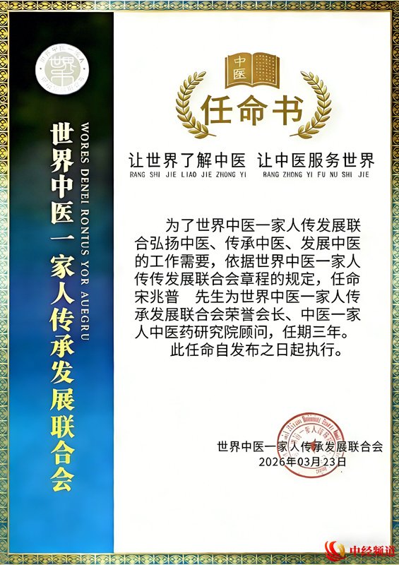 当天,宋兆普被正式荣升为世界中医一家人传承发展联合会名誉会长。这不仅是对他个人从医46年的肯定,更是对所有坚守中医传承之路医者的致敬。