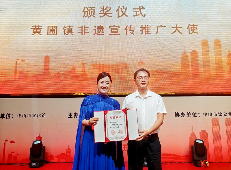 图为:李阳辉副镇长为陶柳华女士颁发“黄圃镇非遗宣传推广大使”荣誉证书(申成勇/摄)
