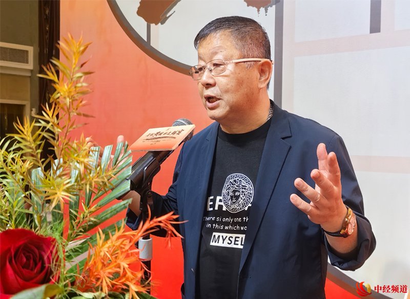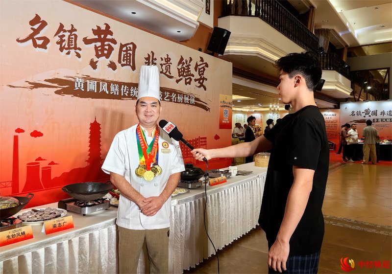 图为:黄圃风鳝传统烹饪技艺大师王深辉先生活动现场接受中经频道采访(申成勇/摄)