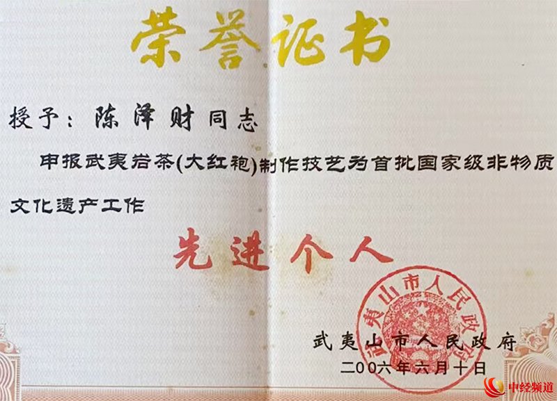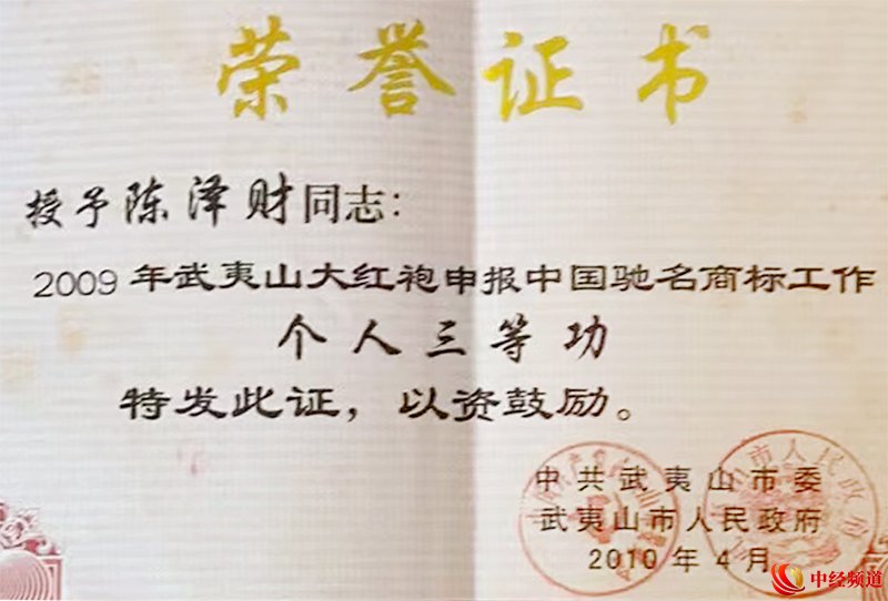 陈泽财事茶20余载期间,历届武夷山市委、市政府始终把茶业作为“一把手”工程在抓。从“武夷山大红袍”地理标志证明商标注册成功开始,武夷山市茶界一直亮点不断、精彩频现:2003年,武夷山被文化部授予全国唯一的“中国茶文化艺术之乡”;2004年,武夷山获全国三绿工程茶业示范县(市);2006年武夷岩茶(大红袍)传统制作技艺作为全国唯一茶类被列入国家首批非物质文化遗产名录,并开始申报世界非物质文化遗产;2007年10月8日,最后一次采制的母树大红袍茶叶送藏国家博物馆,成为该馆收藏的唯一现代茶叶;2008年“武夷山大红袍”地理标志证明商标被认定为福建省著名商标;2010年“武夷山大红袍”被认定为中国驰名商标;同年,“正山小种”申报地理标志证明商标也取得成功。