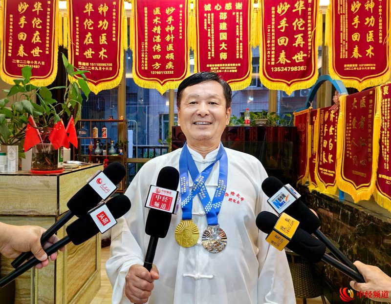 图为:邵建国展示获奖证书及奖牌(申成勇/无人机拍摄)