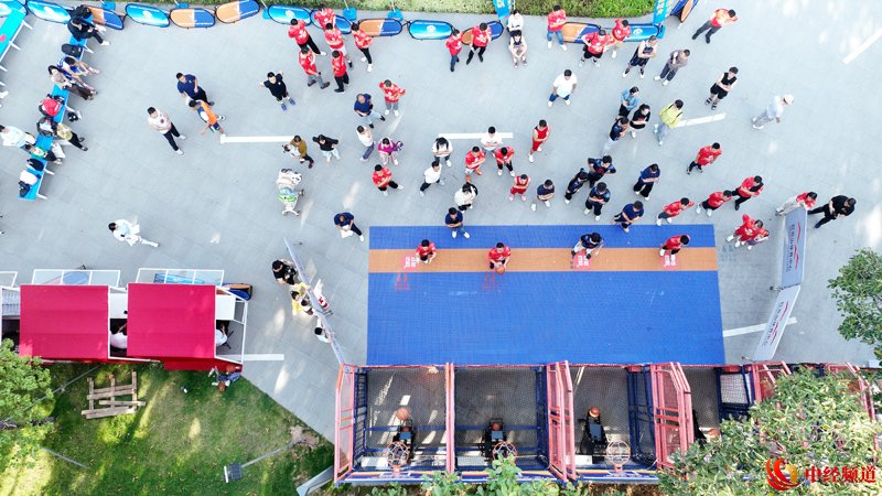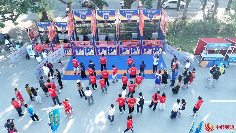 图为:主办方代表、高校校友联合平台智能篮球专委会主席陈冰接受中经频道采访(申成勇/无人机拍摄)