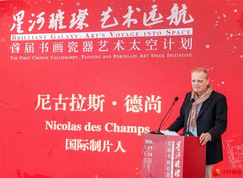 中国外文局文化传播中心副主任王侃、来自法国的著名国际制片人尼古拉斯•德尚等分别致辞,到场的李菊生等六位艺术家分别登台分享创作感悟,畅谈对书画瓷器艺术太空计划的理解与期许;并获得了由中国外文局文化传播中心颁发的“中华文化国际传播高级顾问”的聘书。
