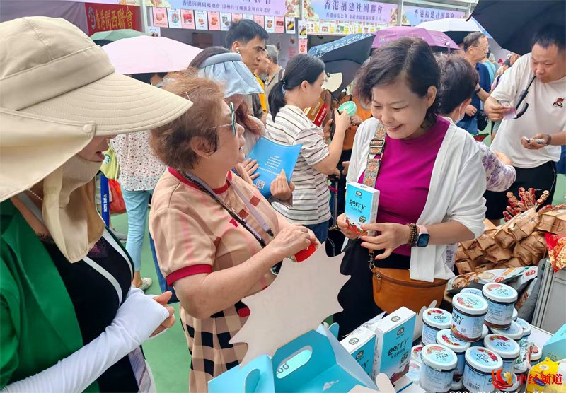 图为:香港第三届家乡嘉年华联谊会上,香港市民对钙果产品爱不释手。