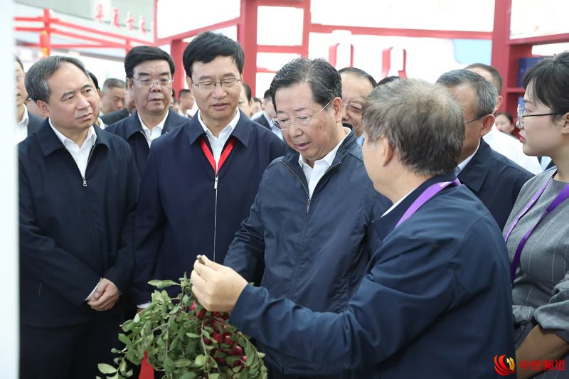 图为:山西农业大学二级教授、钙果之父杜俊杰向时任河南省委书记楼阳生介绍钙果详况