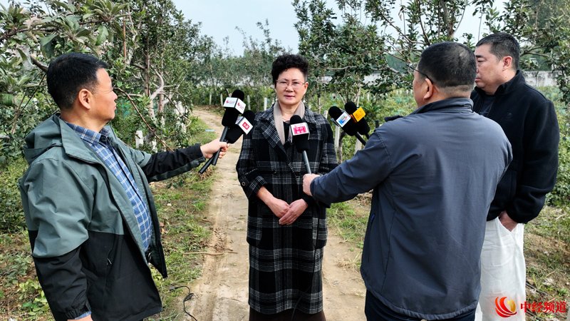 图为:张青娥董事长在钙果种植基地接受媒体采访(申成勇/无人机拍摄)