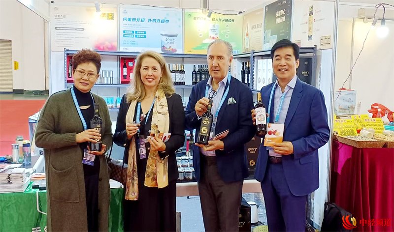 图为:张青娥董事长与国外客商在展会上展示钙果酒